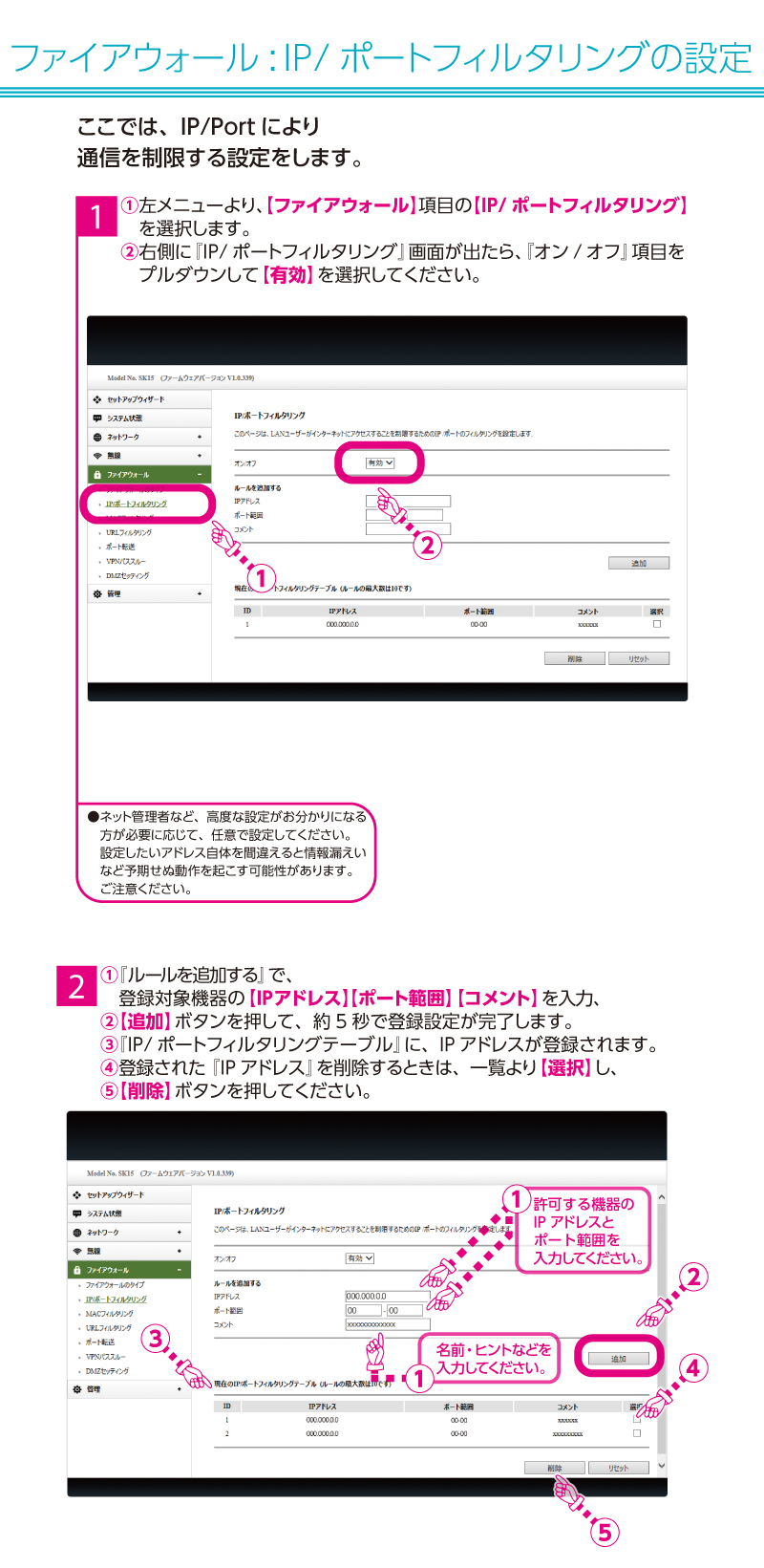 → ファイアウォール:IP/ポートフィルタリングの設定